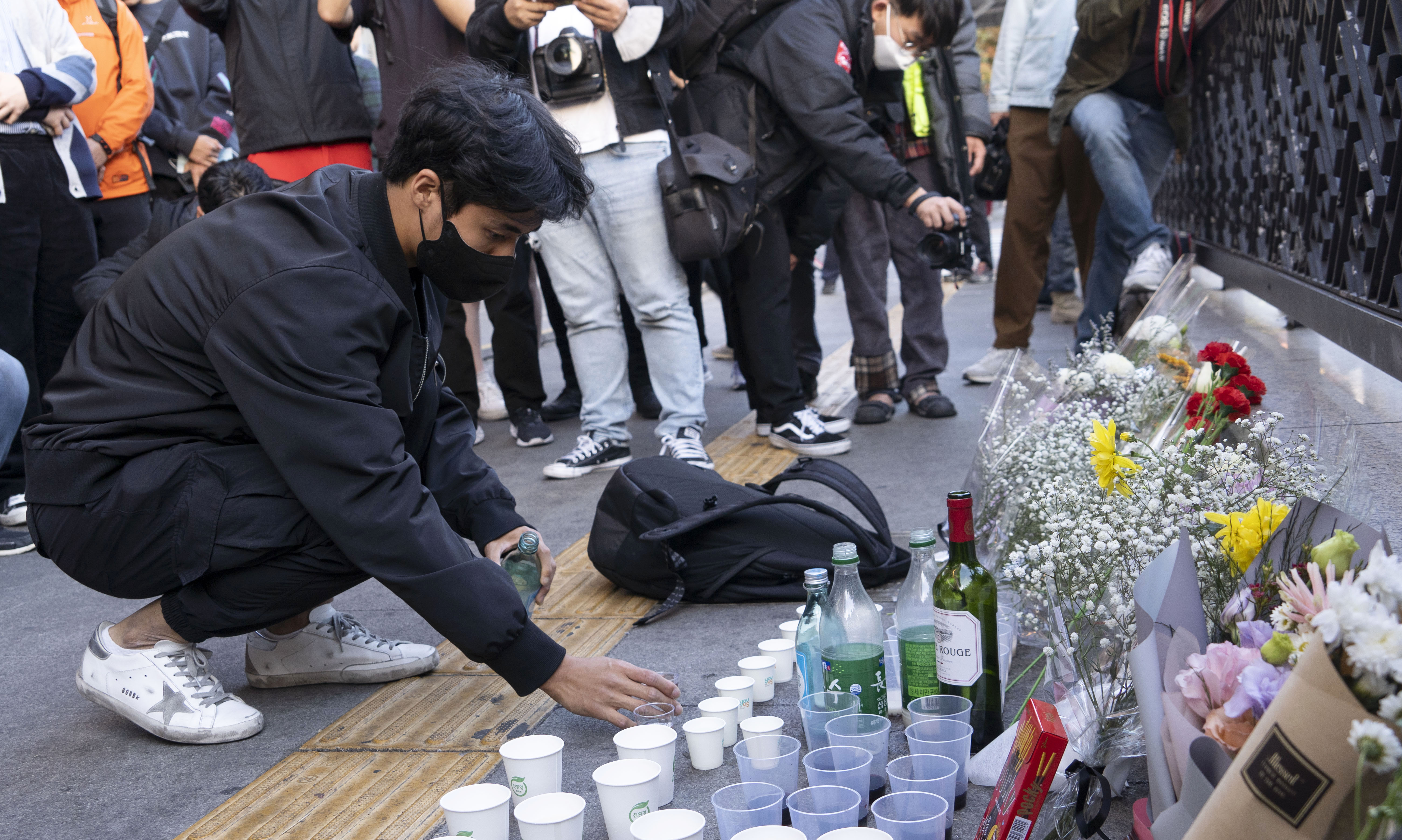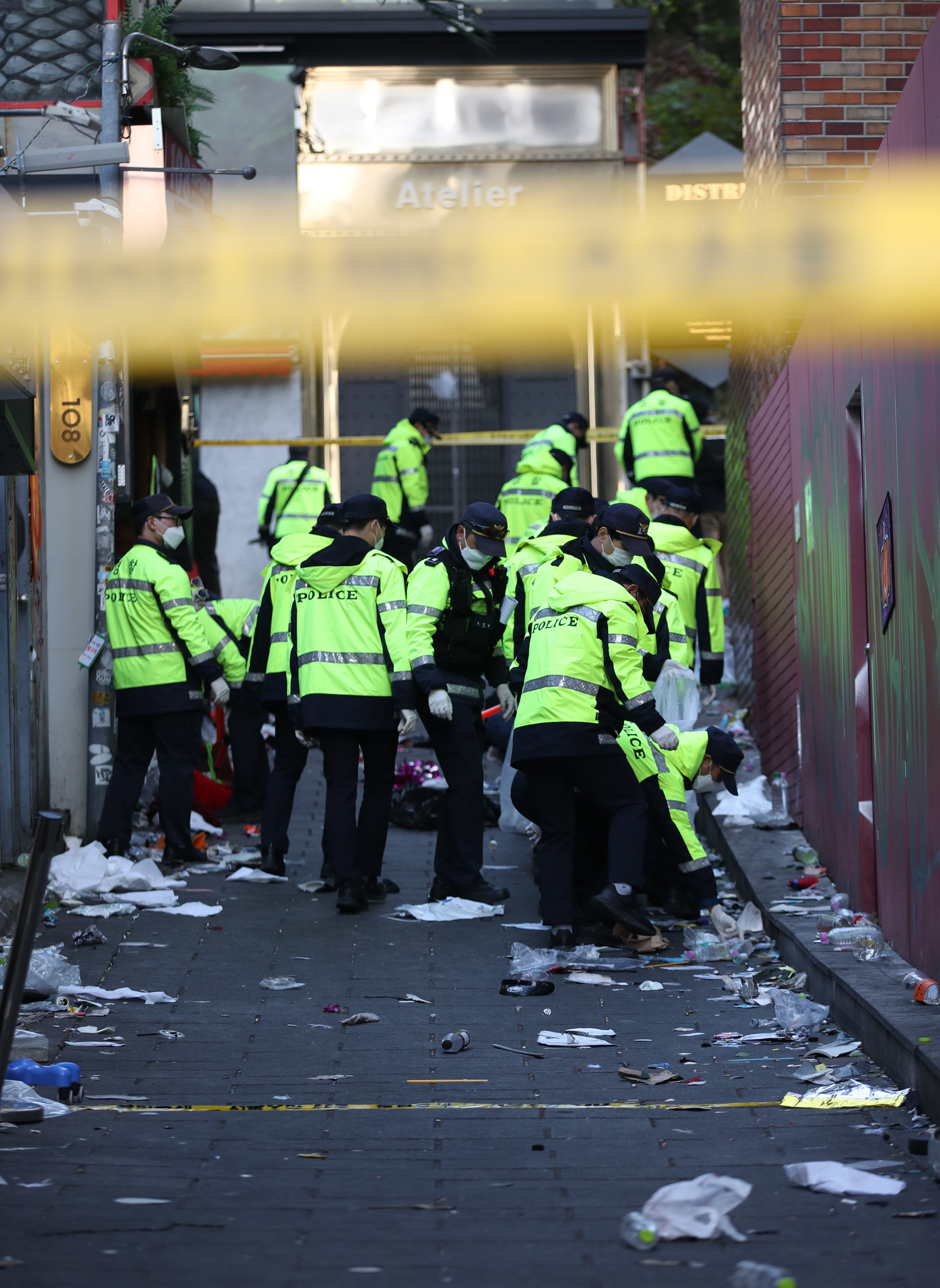 记者在现场看到,事发巷子首尾两处均拉有警戒线,并有警察值守,巷子内地面上散布垃圾,巷子两侧的店面还保留着万圣节的主题装饰。不时有民众前来献花哀悼,一束被摆放在巷口的鲜花上系有挽联,写着“祈求在天之灵得以安息”。一名外籍男士在申报失踪者信息后掩面痛哭。 (据新华社、中新社)