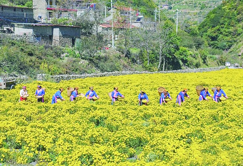 ▲四川阿坝金川县卡撒乡三埂子村种植的12余亩特色皇菊喜获丰收,村民们穿梭在菊花丛中,忙着采摘菊花。