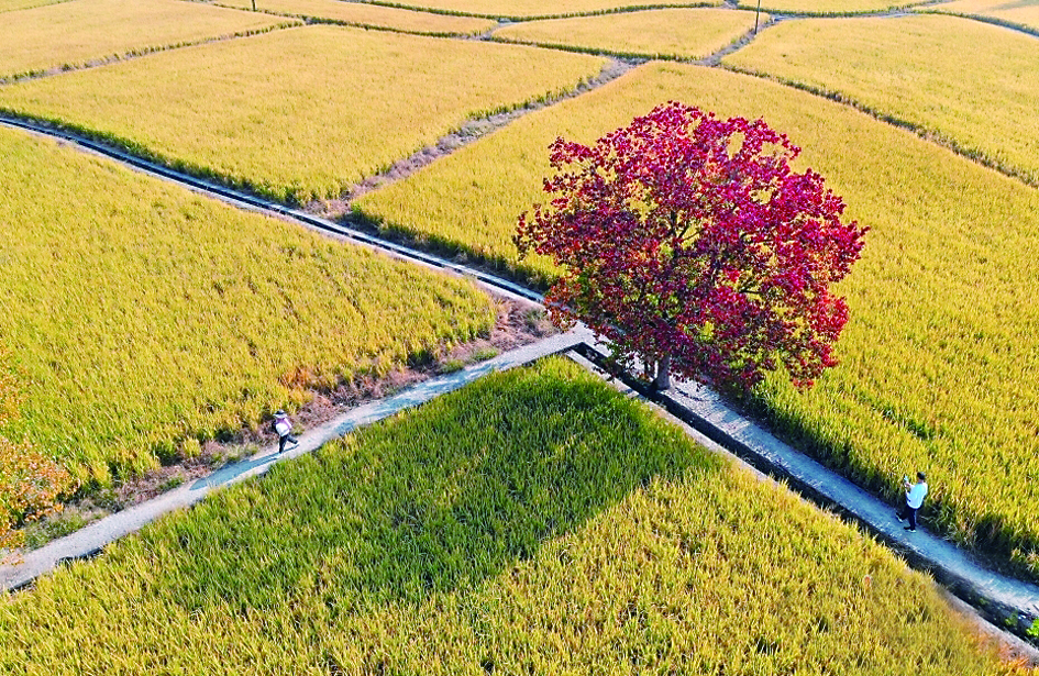 ▲安徽省黄山市黟县宏村镇秋意渐浓,红叶如霜,宛如一幅色彩缤纷的秋日田园画,游人徜徉其中,流连忘返。