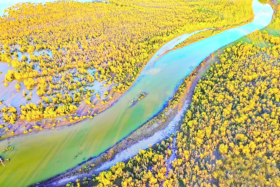◀新疆昌吉,呼图壁县小海子湿地五彩斑斓,美景如画。