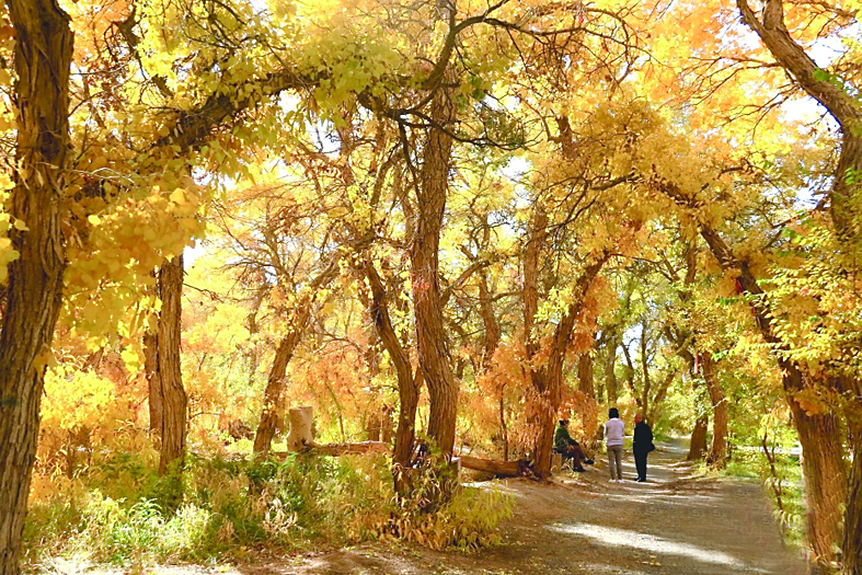 ▲金秋十月,位于甘肃省敦煌市莫高镇的胡杨林被秋色浸染,景色迷人。