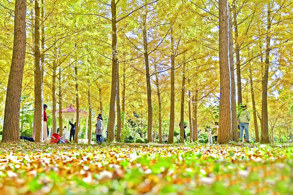 ◀山东省烟台市福山区鲁东园艺场银杏林迎来最佳观赏季,吸引市民前往观光。