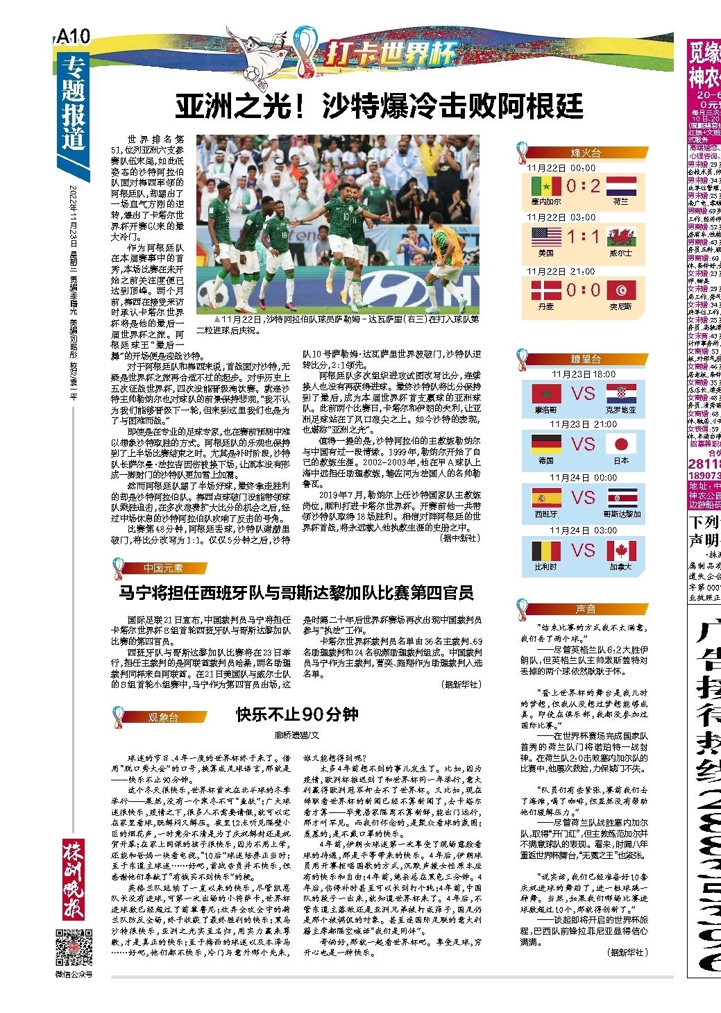 马宁将担任西班牙队与哥斯达黎加队比赛第四官员
