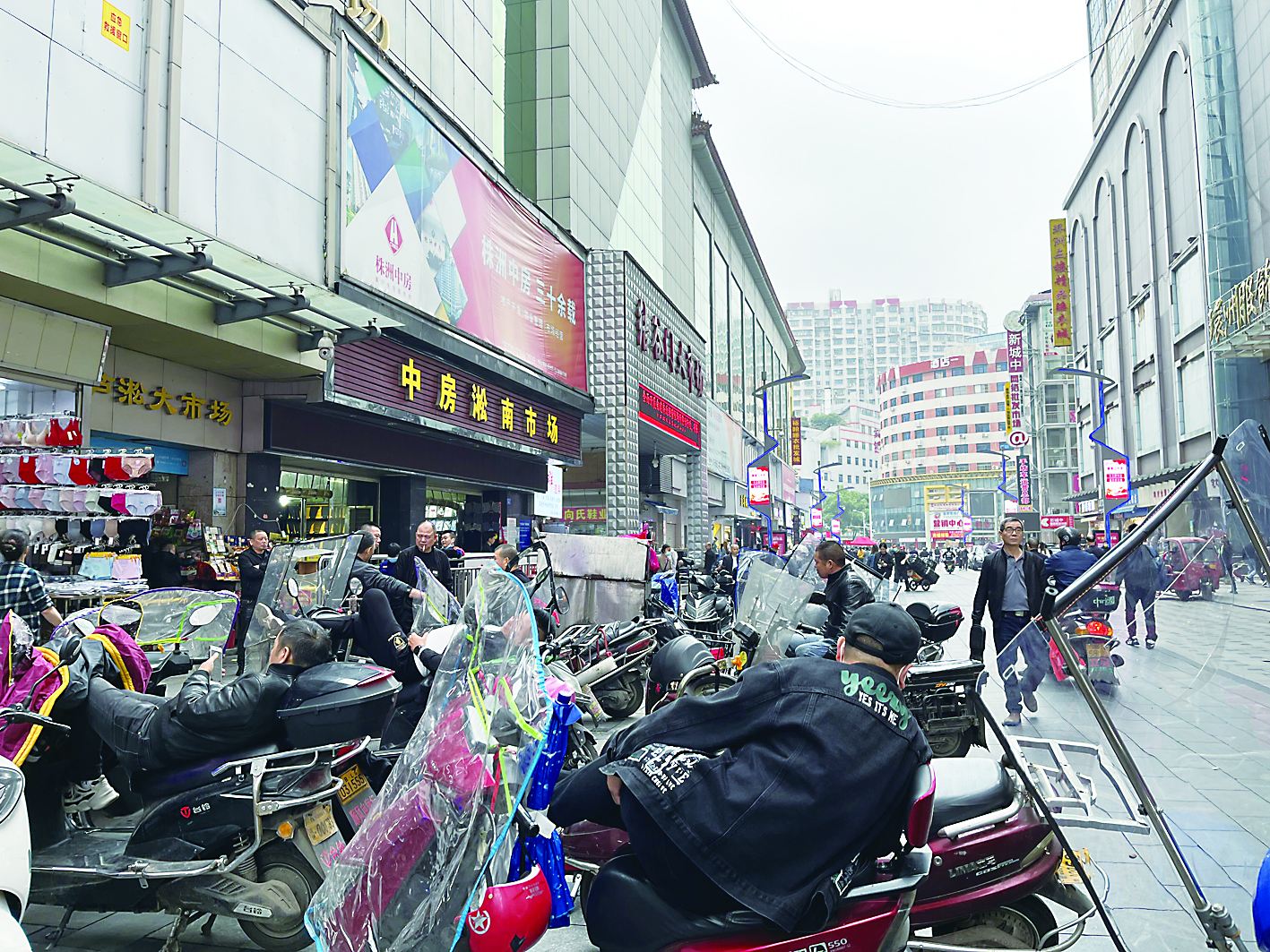 ◀人民路步行街,一些车主坐在电动车上“守车”。 记者/刘平 摄