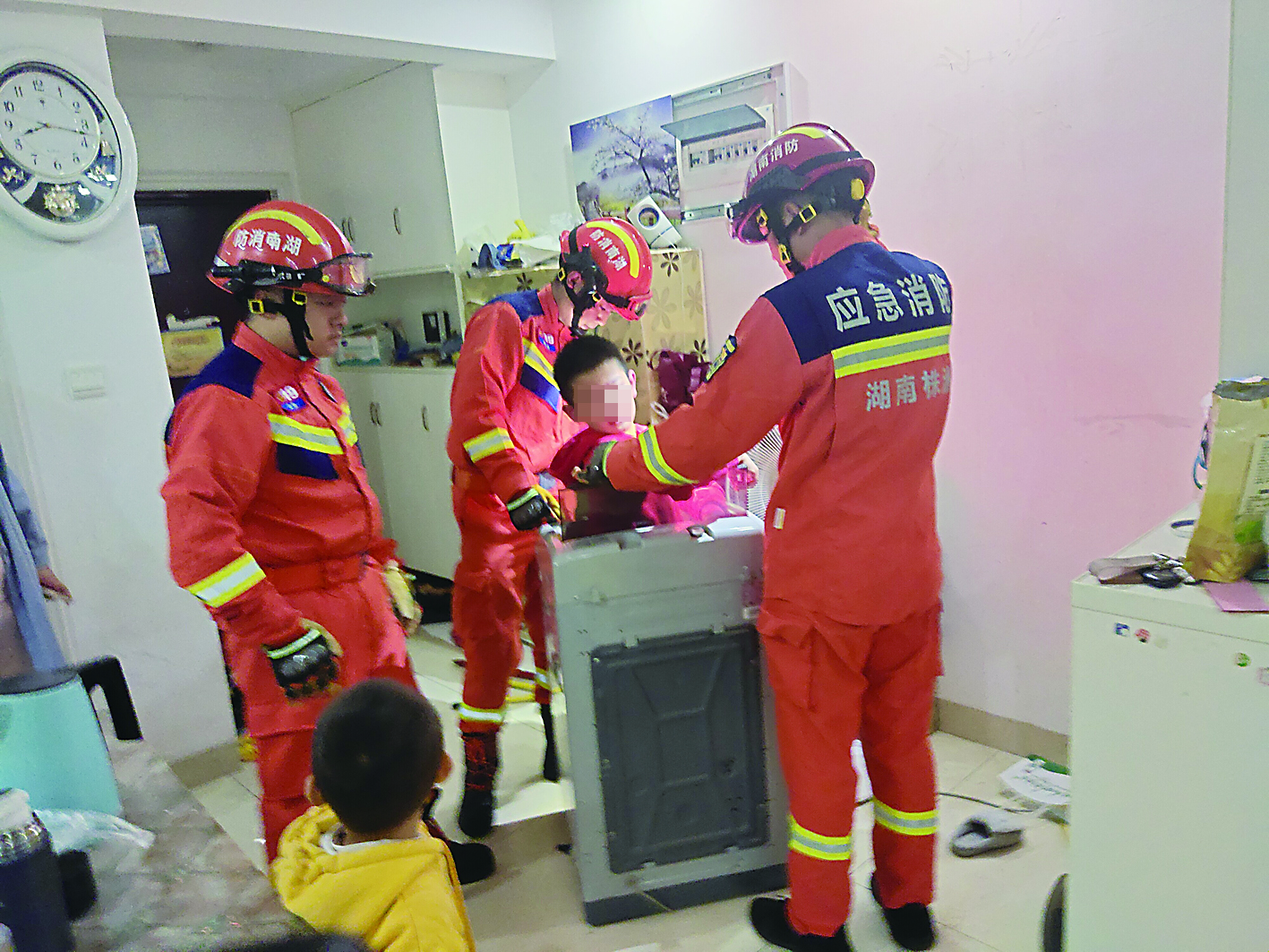 本报讯(株洲晚报融媒体记者/李逸峰 通讯员/左阳)10月30日晚上8时许,株洲经开消防救援大队职教城消防站接到报警称,向阳广场三一歌雅郡一名7岁小男孩被卡在洗衣机内筒内。消防员立即前往现场进行处置,经过20分钟的紧急救援,小孩安全脱险。