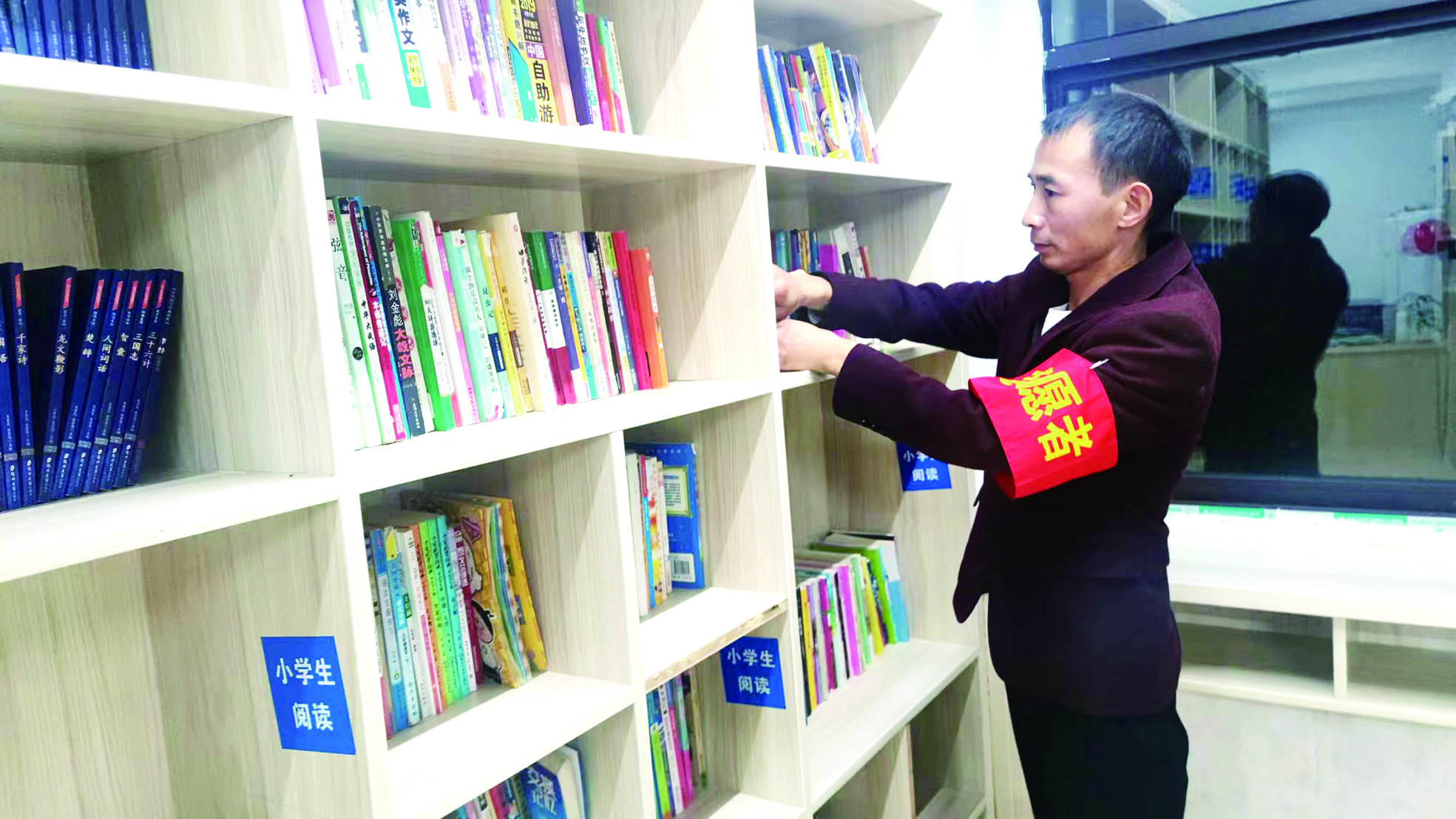 ▲袁高江在整理小区书屋里的书。记者/杨凌凌 摄