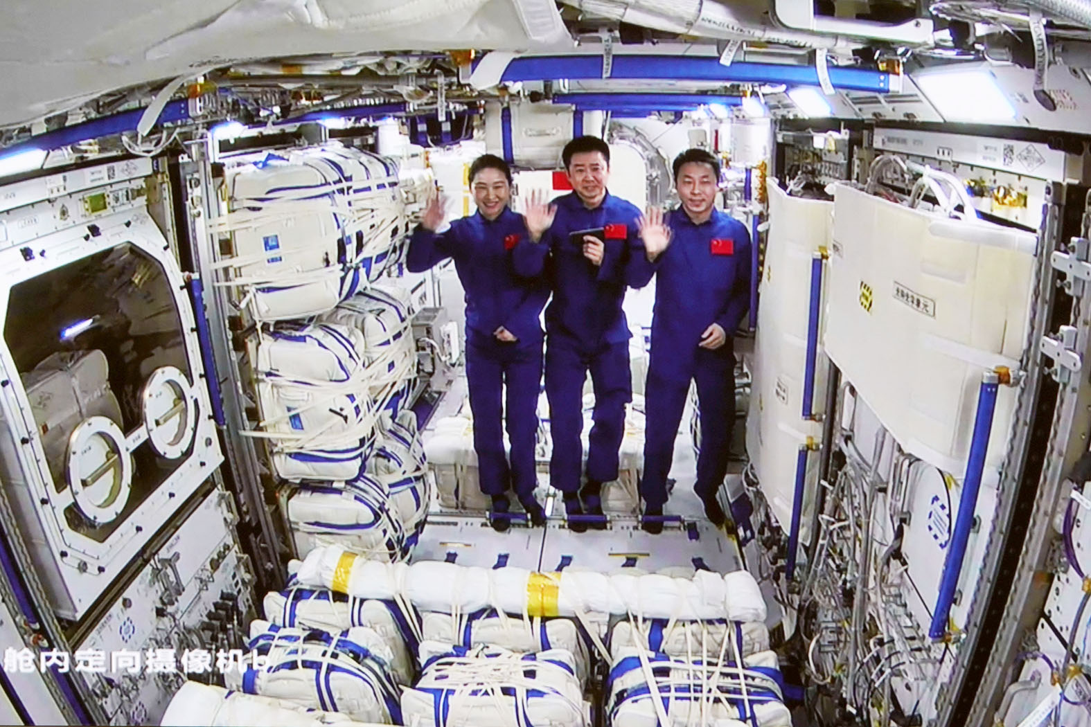 ▲11月3日在北京航天飞行控制中心拍摄的神舟十四号航天员陈冬(中)、刘洋(左)、蔡旭哲进入梦天实验舱。新华社发/孙丰晓 摄