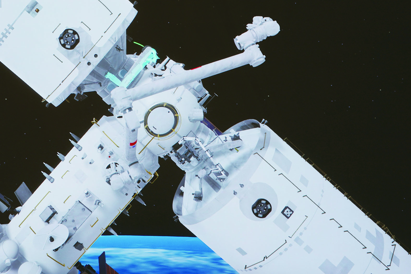 ▲11月3日在北京航天飞行控制中心拍摄的空间站梦天实验舱完成转位的模拟图像。新华社发/孙丰晓 摄