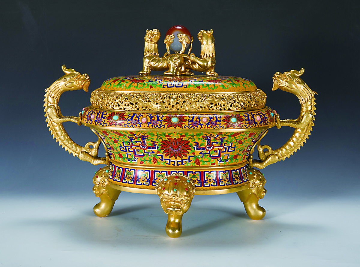 景泰蓝正名“铜胎掐丝珐琅”,俗名“珐蓝”,又称“嵌珐琅”,是一种在铜质的胎型上,用柔软的扁铜丝,掐成各种花纹焊上,然后把珐琅质的色釉填充在花纹内烧制而成的器物 。《双龙腰圆螭虎熏》造型典雅雄浑,纹样繁富,色彩清丽庄重,给人以圆润坚实、细腻工整、金碧辉煌、繁花似锦的艺术感受。以双龙为耳螭虎为盖饰,黄色为底,暗红与蓝绿为饰,色彩和谐华贵,图案刚劲有力。作品制作集美术、工艺、雕刻、镶嵌、玻璃熔炼、冶金等专业技术为一体,具有鲜明的民族风格和深刻文化内涵。(本报综合)