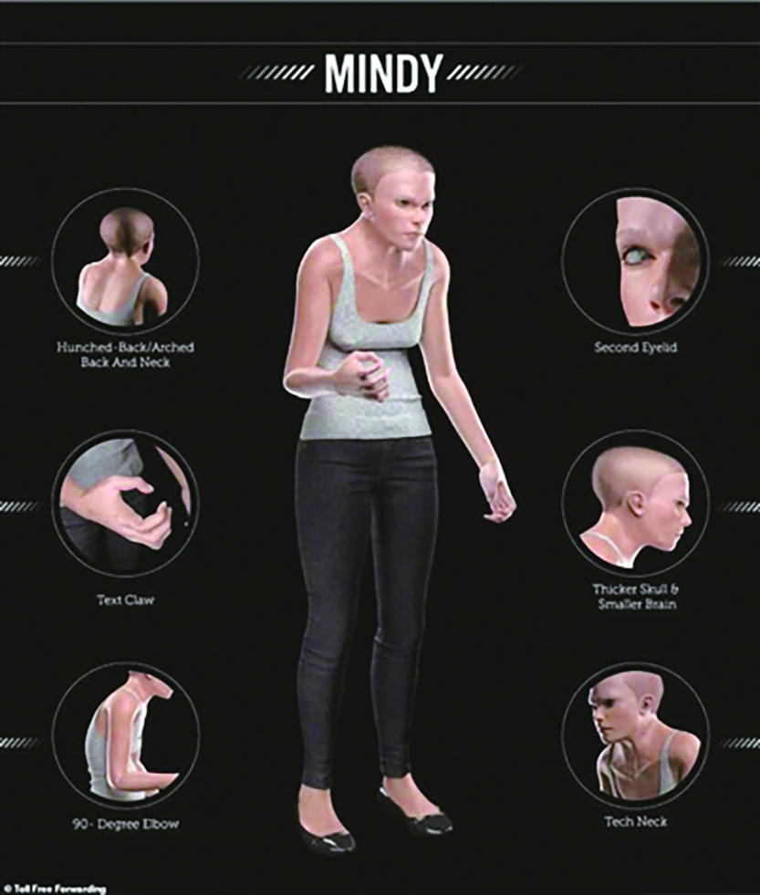 模型显示,“明迪”的肘部是90度的,这种肘也被称为“智能手机肘”。这是由于用手机时手臂的典型位置造成的。此外,“明迪”还长出了第二层眼睑,以阻挡屏幕中的蓝光传入眼睛。(本报综合)