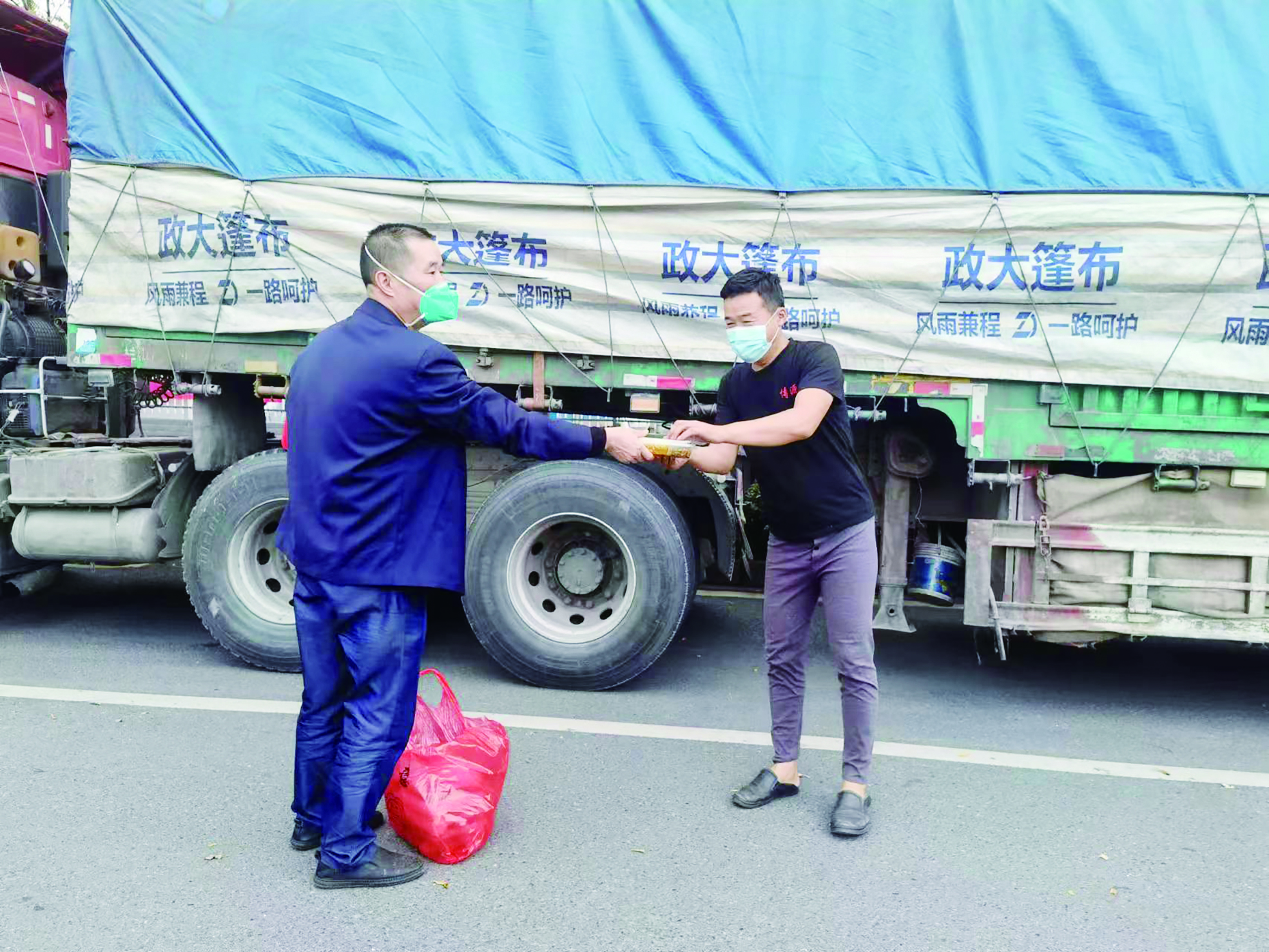 ▲龙泉街道工作人员给司机送水和食物。通讯员/欧阳莹 摄