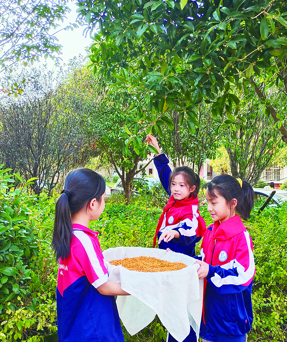 ◀采摘桂花。校方供图