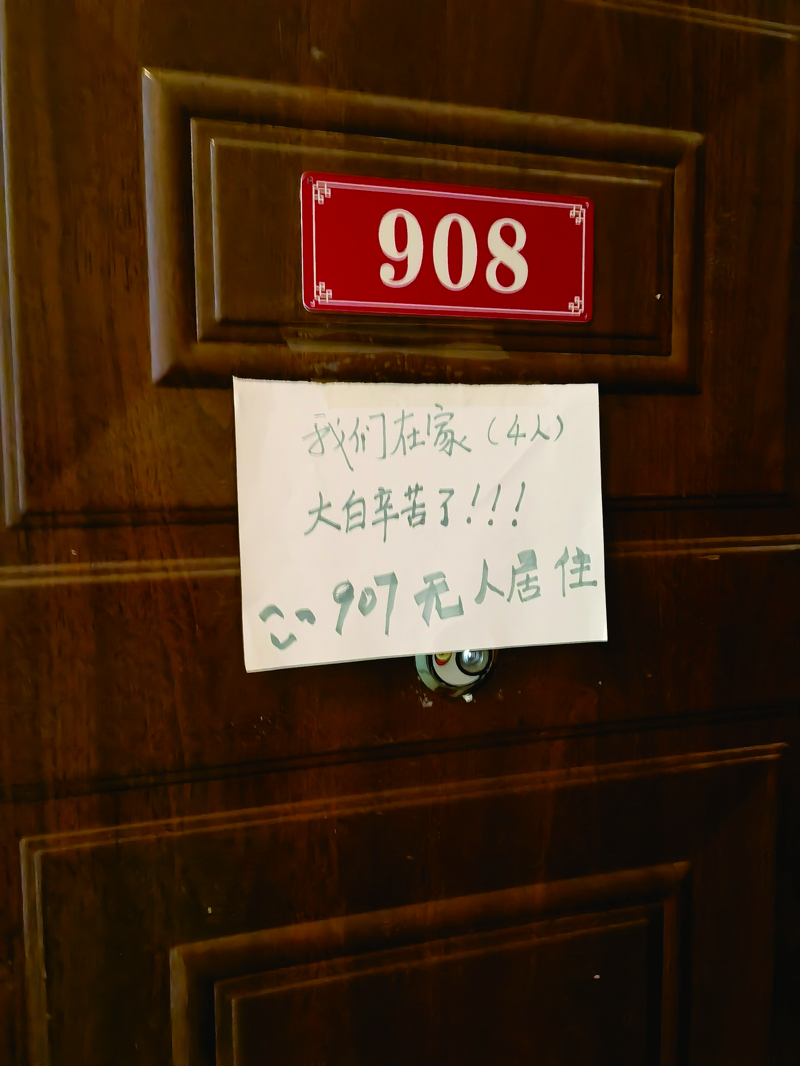 近日,荷塘区金山街道晏家湾社区一住户的门上出现了一则温馨提示——“我们在家(4人),大白辛苦了!907无人居住”。一是提醒核酸采样的工作人员提前准备棉签数量,二是不用再去敲907住户的门,既减少了触摸和交谈,又节约了时间,让工作人员感觉特别暖心。