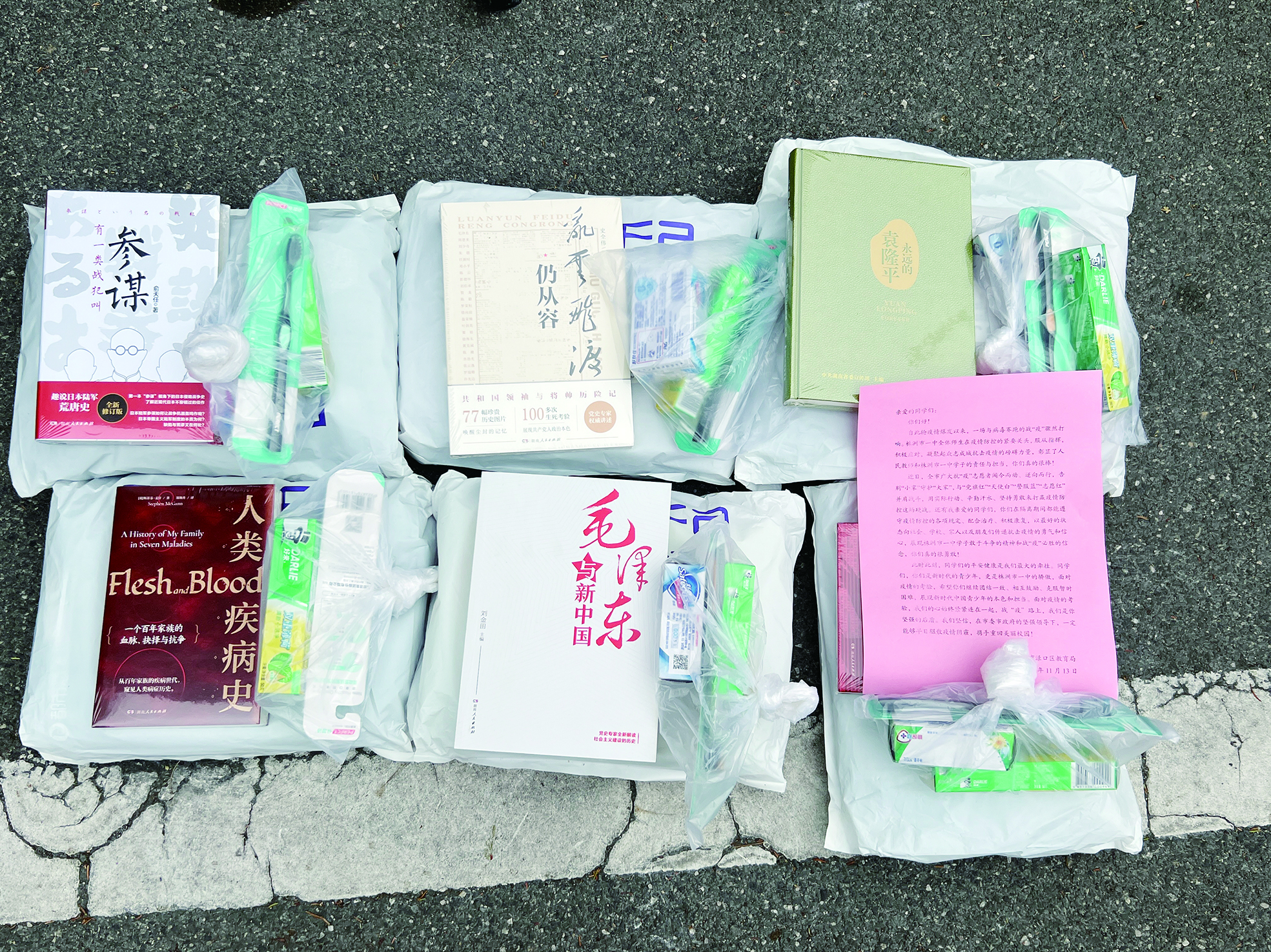 11月11日,渌口区教育局收到求助信息:在渌口区人民医院进行治疗的学生未带够必备生活物品去隔离点,需要增添换洗衣物。渌口区教育局得知情况后,马上组织班子成员收集隔离师生人员需求,并为他们准备“暖心礼包”。礼包中,有舒适的换洗衣物、必备的生活物品和精心挑选的书籍,以及《我们并肩作战,共克时艰——致集中观察师生的一封信》。