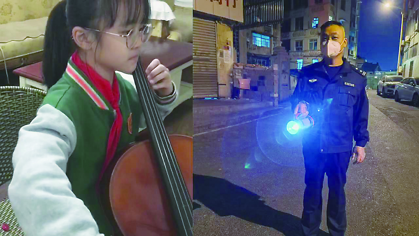 ▲左图为静静通过视频,为爸爸演奏《我的祖国》;右图为曹东正在执勤。