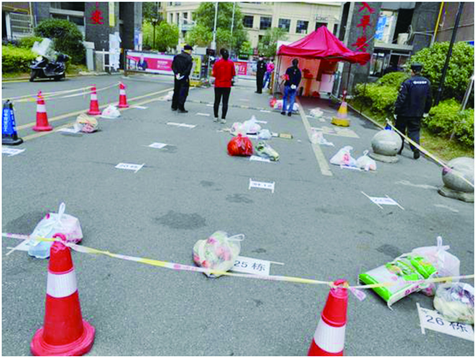 为了保证小区有序运转,小区党支部、物业和志愿者们全天无休,为小区保驾护航。他们带着红袖章在小区内宣传巡逻,引导居民有序活动,不扎堆、不串门,将居民们线上下单的物资运送到安全区域,按楼栋排好序号,引导居民们排队自提。针对仍需居家隔离的对象、腿脚不便的老人,他们提供送货上门的服务,保障着少数群体的生活。