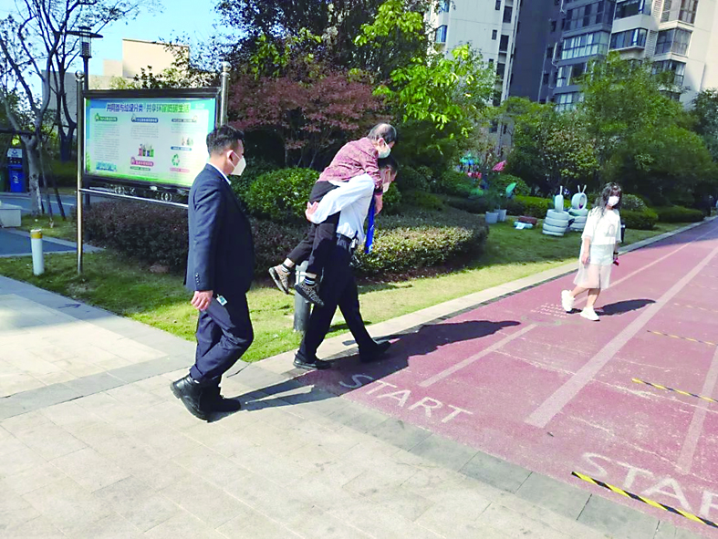 ▲得知喻阿姨出门不便,美的蓝溪谷物业服务中心工作人员主动上门背着喻阿姨下楼做核酸采样。