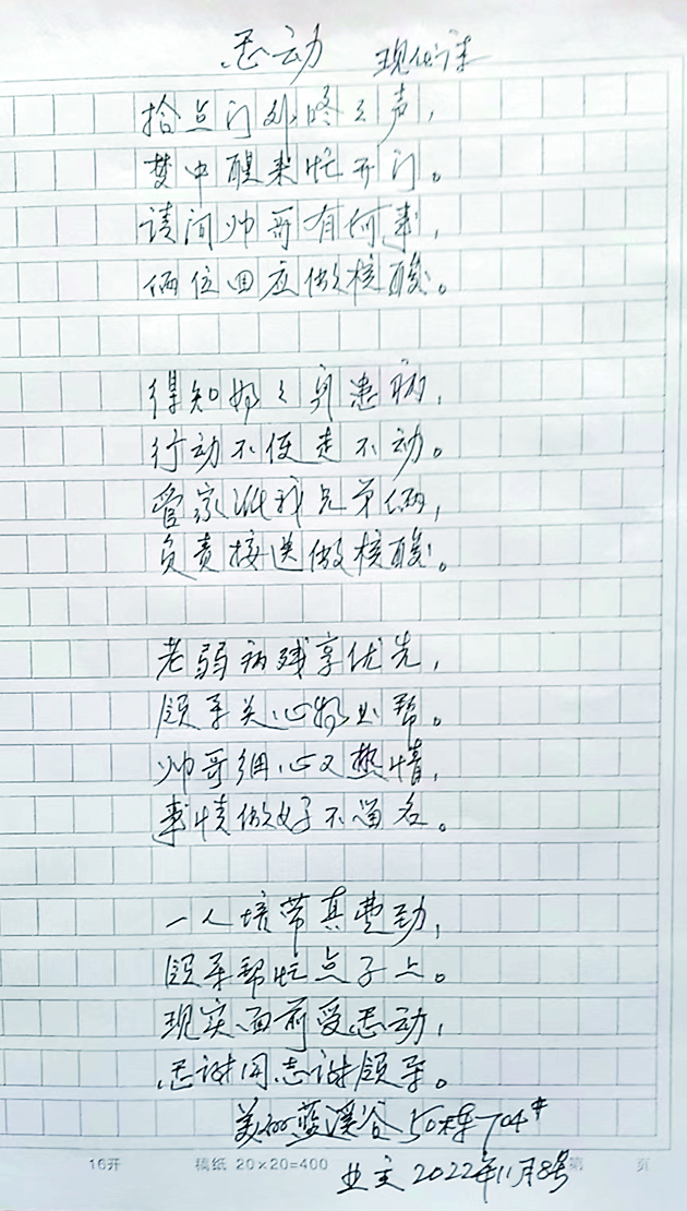 美置服务及时接收反馈,主动上门解忧。喻阿姨出门不便,物业人员便背着她下楼做核酸采样,为其开辟绿色通道;考虑两位老人买菜不便,还上门送上爱心蔬菜包,解决了老两口生活燃眉之急。美置服务的暖心举动,让喻爷爷心中感慨万分,于是提笔写了这首《感动》代表业主致谢所有工作人员。