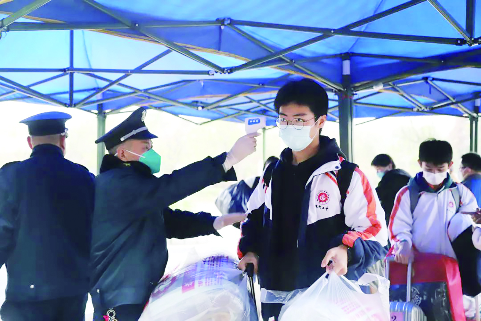 当日,株洲市北附高级中学高三年级341名学生自早上7点开始错峰返校,学生们经过测温通道排队有序进入学校,安静的校园再次热闹起来。