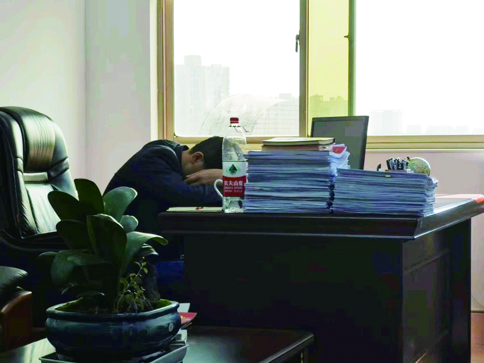 ▲刚结束督查工作的汤灿疲惫地趴在办公桌上休息。通讯员供图