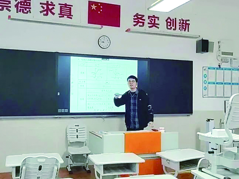 ▲南方中学教师在无人的教室里直播网课。 受访者供图