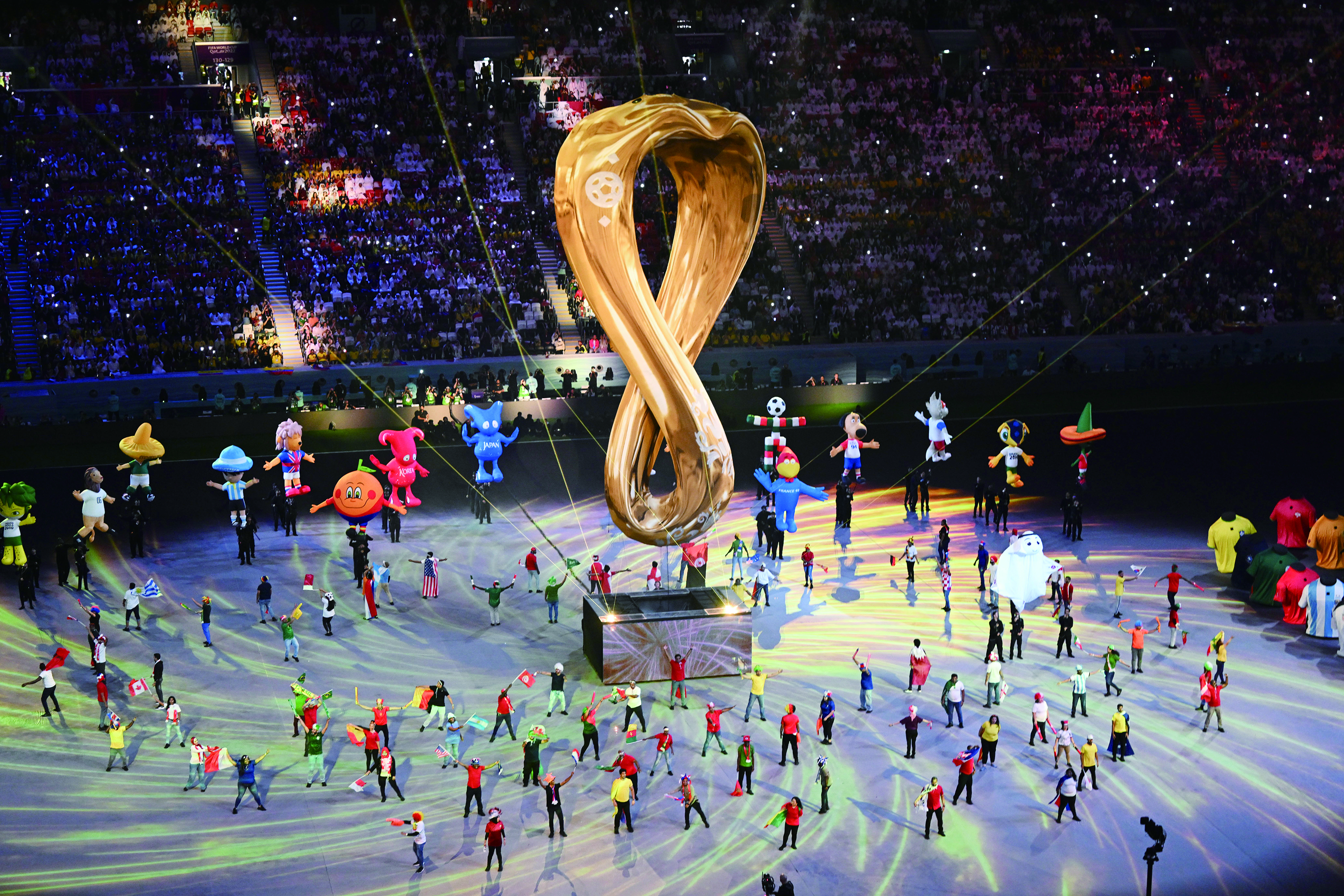 ▲11月20日,2022年卡塔尔世界杯开幕式在海湾球场举行。图为会徽出现在开幕式现场。(本届世界杯比赛有何看点,详见A08版) 新华社记者/肖艺九 摄