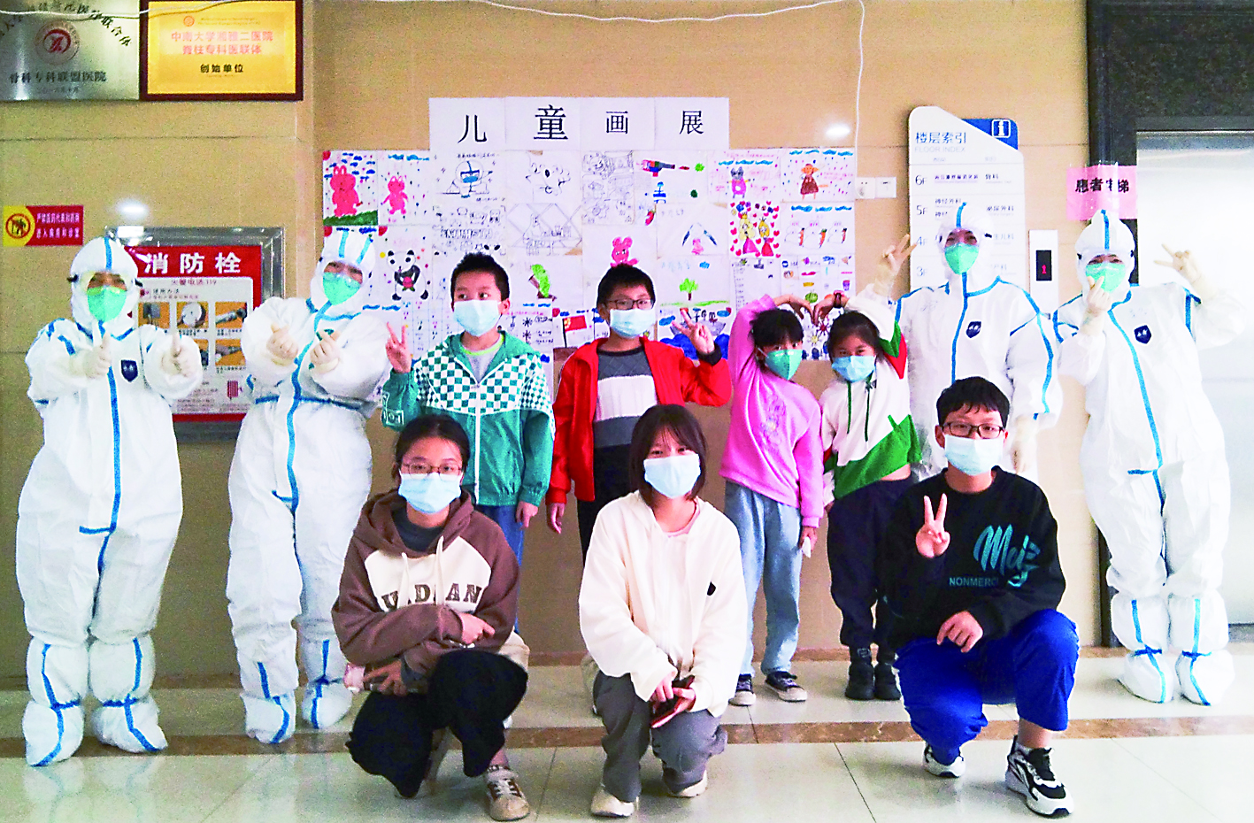 ▲隔离病房里,孩子们展示画作。通讯员供图