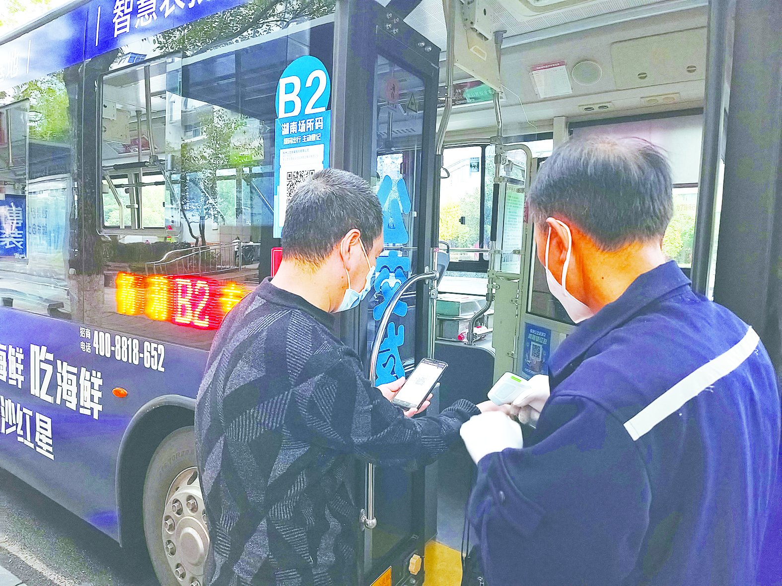车辆进站,在随车的疫情防控监督员的指挥下,乘客有序扫车辆上的场所码,待查验信息、测量体温后上车。