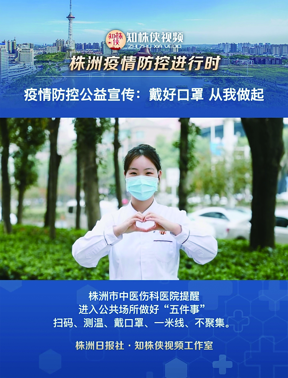 株洲市中医伤科医院提醒进入公共场所做好“五件事”:扫码、测温、戴口罩、一米线、不聚集。