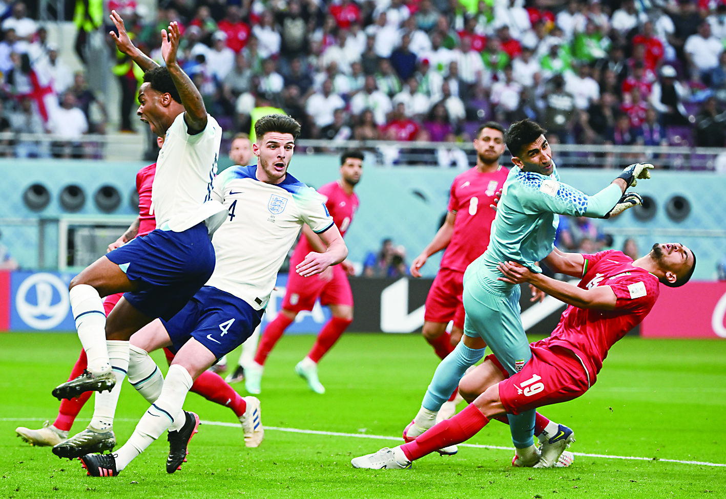 ▲11月21日,伊朗队守门员贝兰万德(右二)在出击时与队友马吉德·侯赛尼发生碰撞。