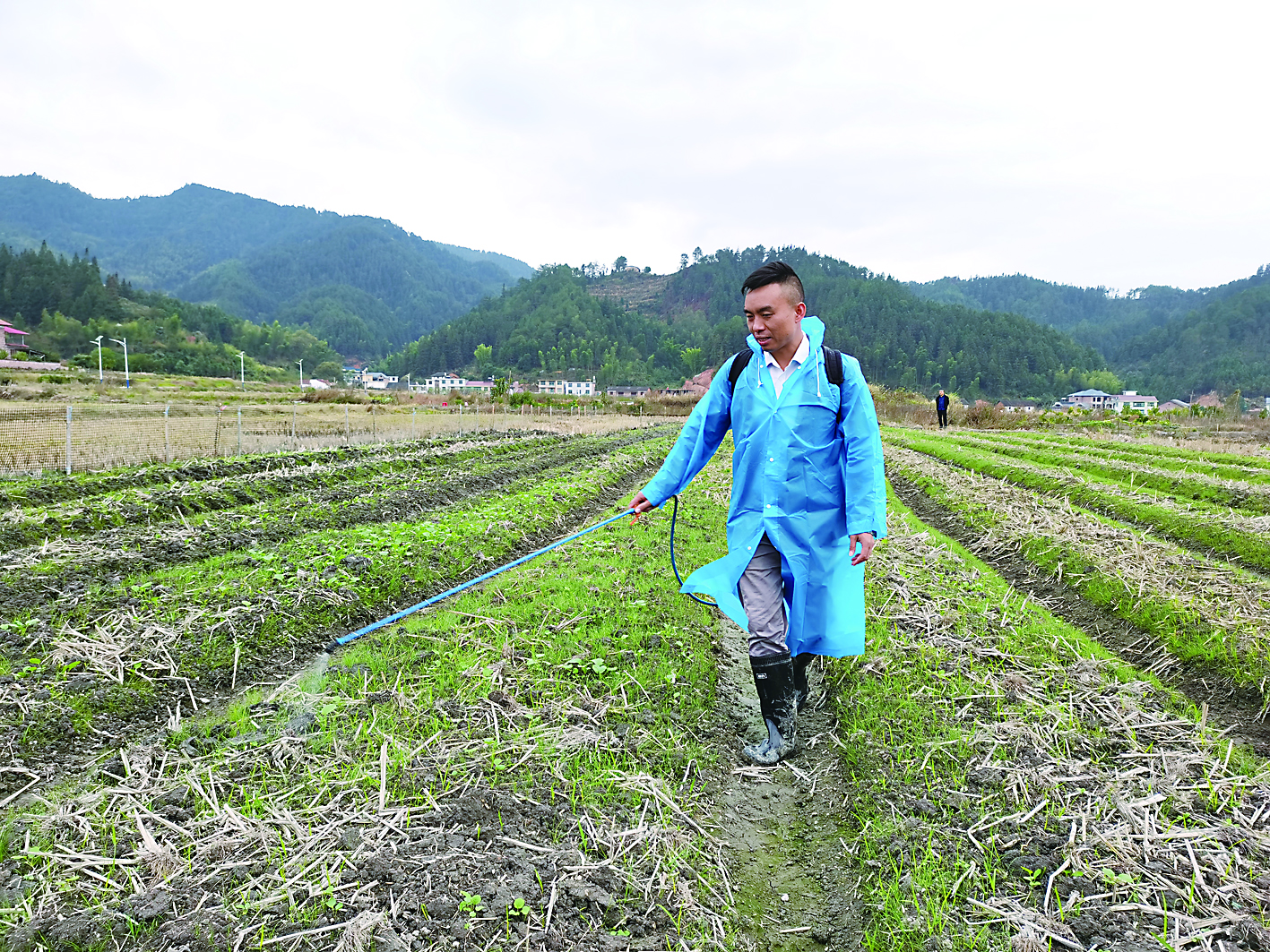 ◀村民正在打理油菜田。通讯员供图