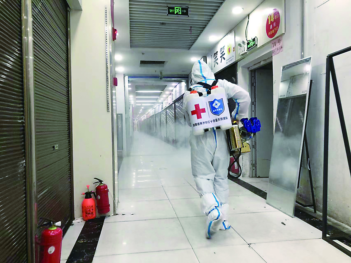 ▲消杀队员在芦淞市场群消毒。 记者/杨凌凌 摄