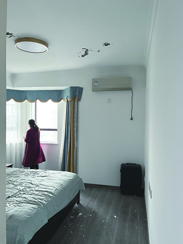 回到房间,眼前的景象令她震惊,白色的天花板上出现多块形状不规则的“黑斑”。地板上和床上多处掉落有石灰块、水泥渣,多处脱落位置有钢筋裸露。