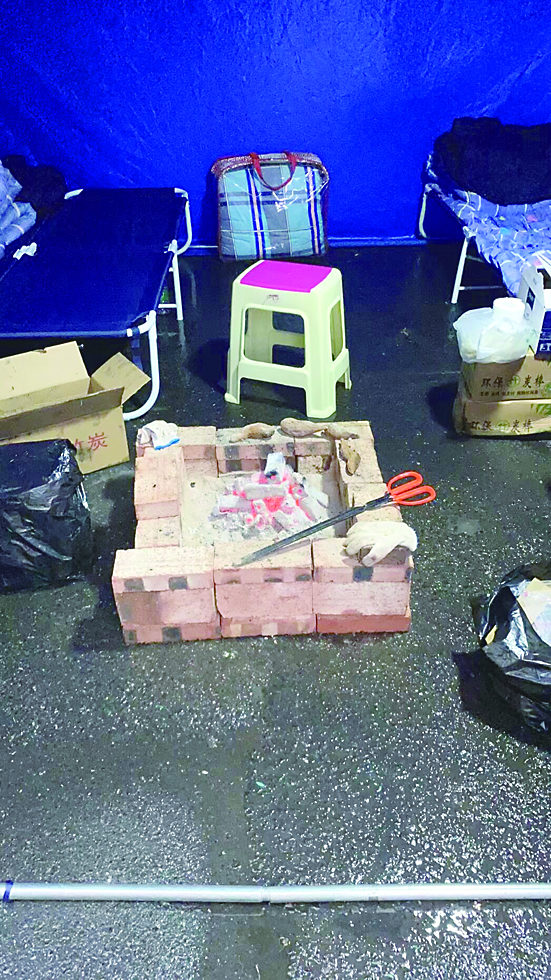 ▲夜晚,帐篷内地面潮湿,值守的志愿者烧炭取暖。 受访者供图