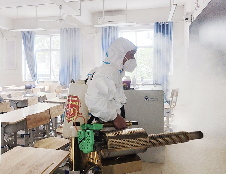 在校园内,队员们根据实地情况,科学制定消杀方案及不同环境下的消杀药物剂量、浓度配比,对学校各教室、办公室、活动室、食堂、楼梯、走廊、卫生间等场所进行了专业规范的环境消杀。