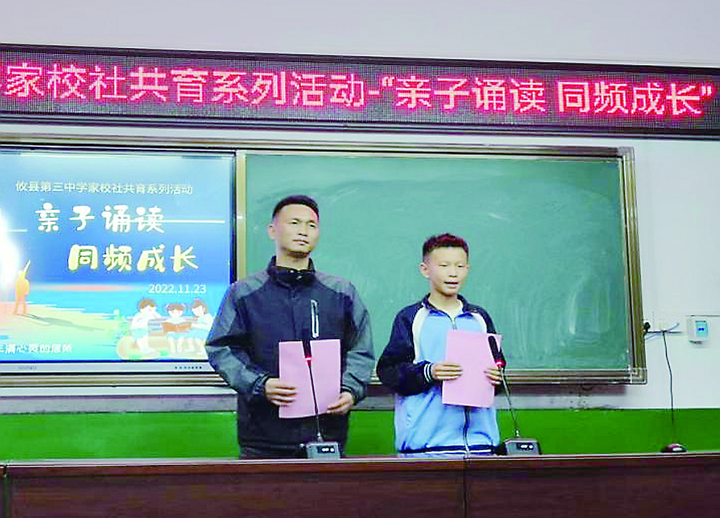 本报讯(株洲晚报融媒体记者/戴凛 通讯员/李晓岚)慈母爱无尽,严父情不止。11月23日,攸县第三中学线上线下同时集会,开展“亲子诵读,同频成长”亲子诵读活动。