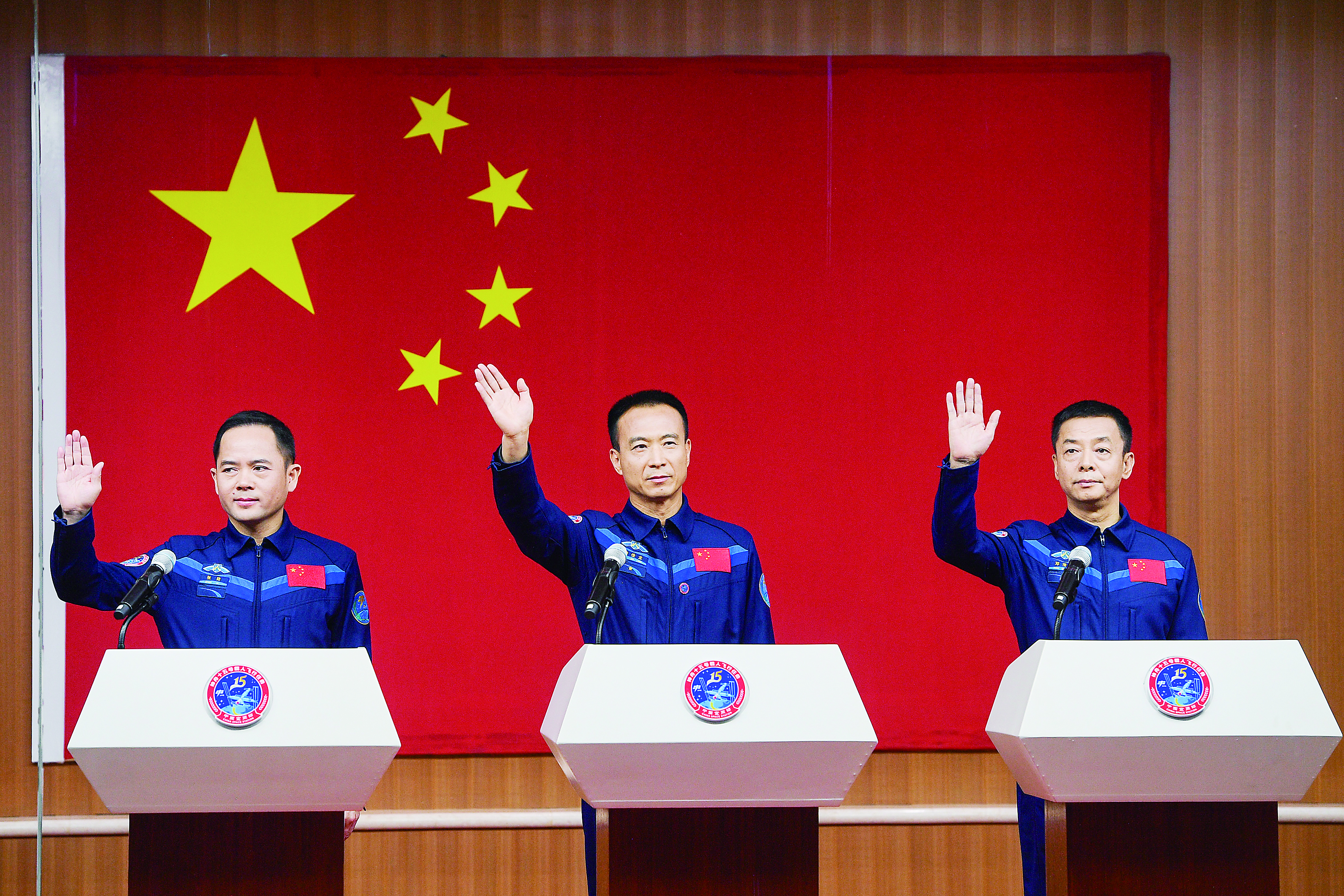 神舟十五号载人飞船 ▲神舟十五号载人飞船将于今日23时08分发射,飞行乘组由航天员费俊龙、邓清明和张陆组成,费俊龙担任指令长,乘组将在轨工作生活6个月。这是载人航天工程今年的第六次飞行任务,也是空间站建造阶段最后一次飞行任务。图为费俊龙(中)、邓清明(右)、张陆昨日在酒泉卫星发射中心问天阁与中外媒体记者集体见面,并回答记者提问。 新华社记者 刘磊 摄