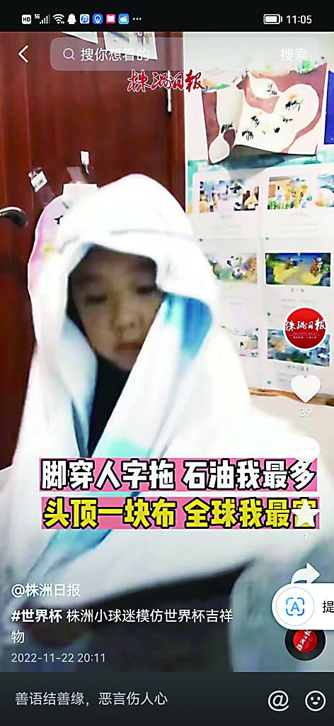 近日,一名株洲小朋友头戴白毛巾,手舞足蹈,逗趣模仿2022卡塔尔世界杯的吉祥物“拉伊卜”,萌化了众多网友。