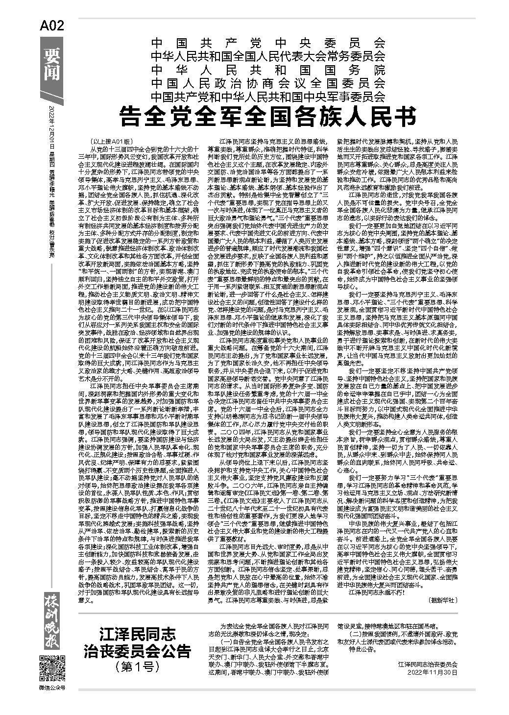 江泽民同志 治丧委员会公告