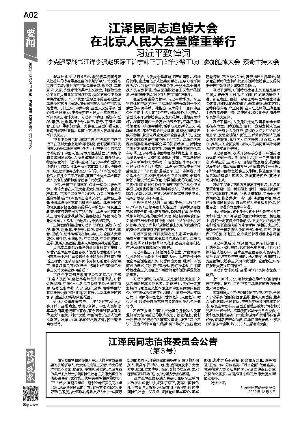 江泽民同志追悼大会在北京人民大会堂隆重举行习近平致悼词李克强栗战书汪洋李强赵乐际王沪宁韩正丁薛祥李希王岐山参加追悼大会 蔡奇主持大会