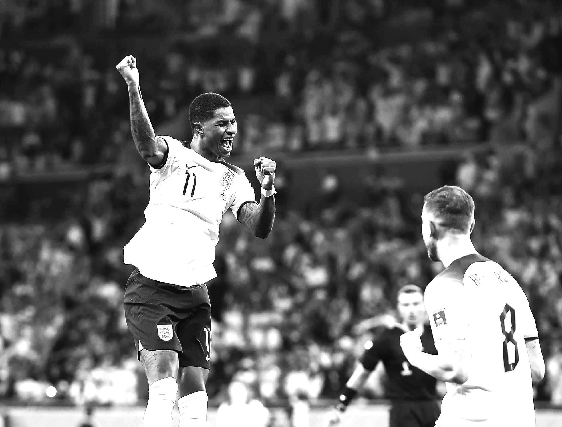 ▲11月29日,英格兰队球员拉什福德(左)在比赛中进球后庆祝。新华社记者/韩岩 摄