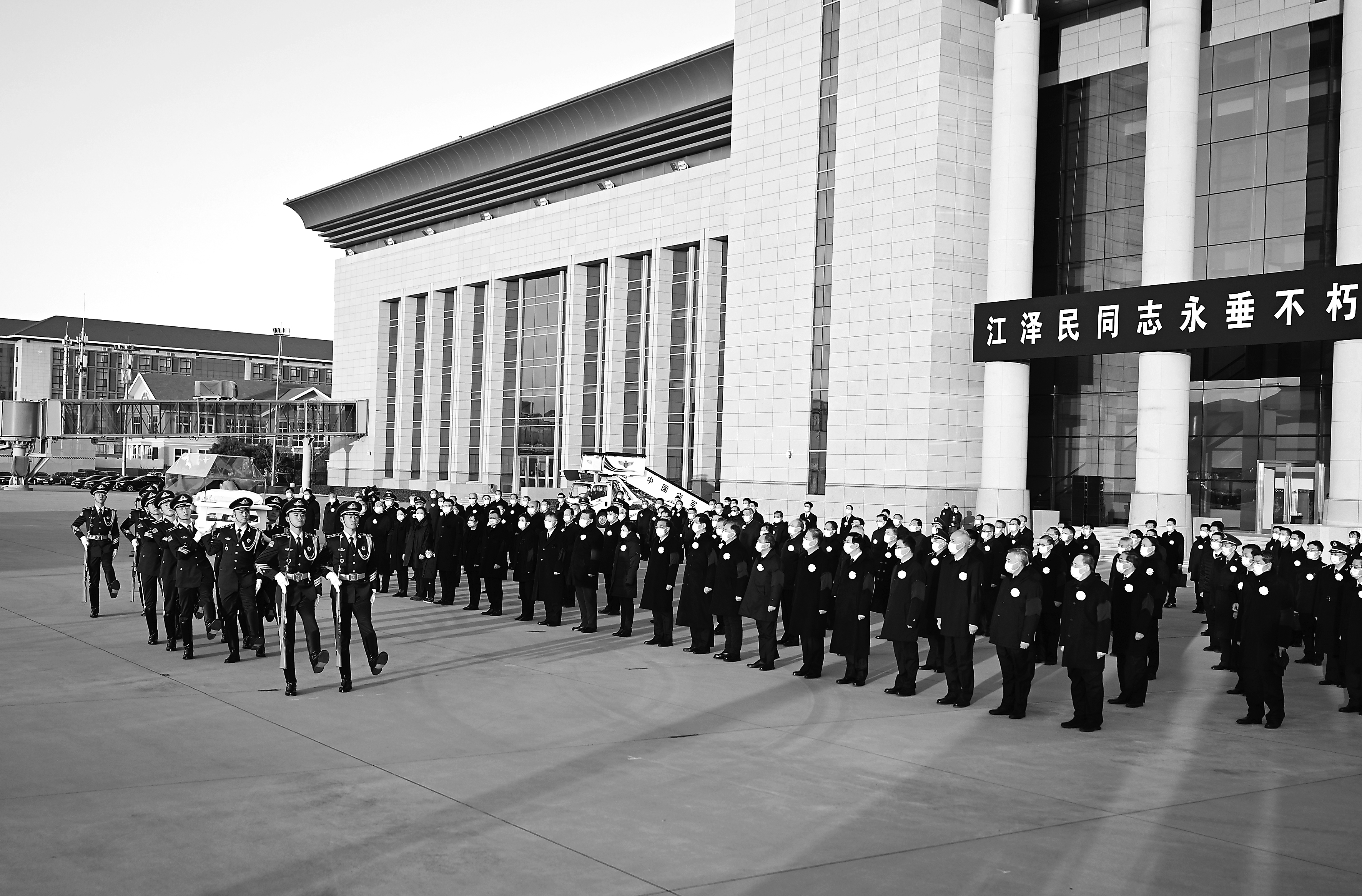 北京西郊机场国旗半垂,气氛庄严肃穆,黑底白字横幅上写着:“江泽民同志永垂不朽”“江泽民同志永远活在我们心中”。习近平和夫人彭丽媛等胸佩白花、臂戴黑纱,神情凝重地在停机坪肃立。