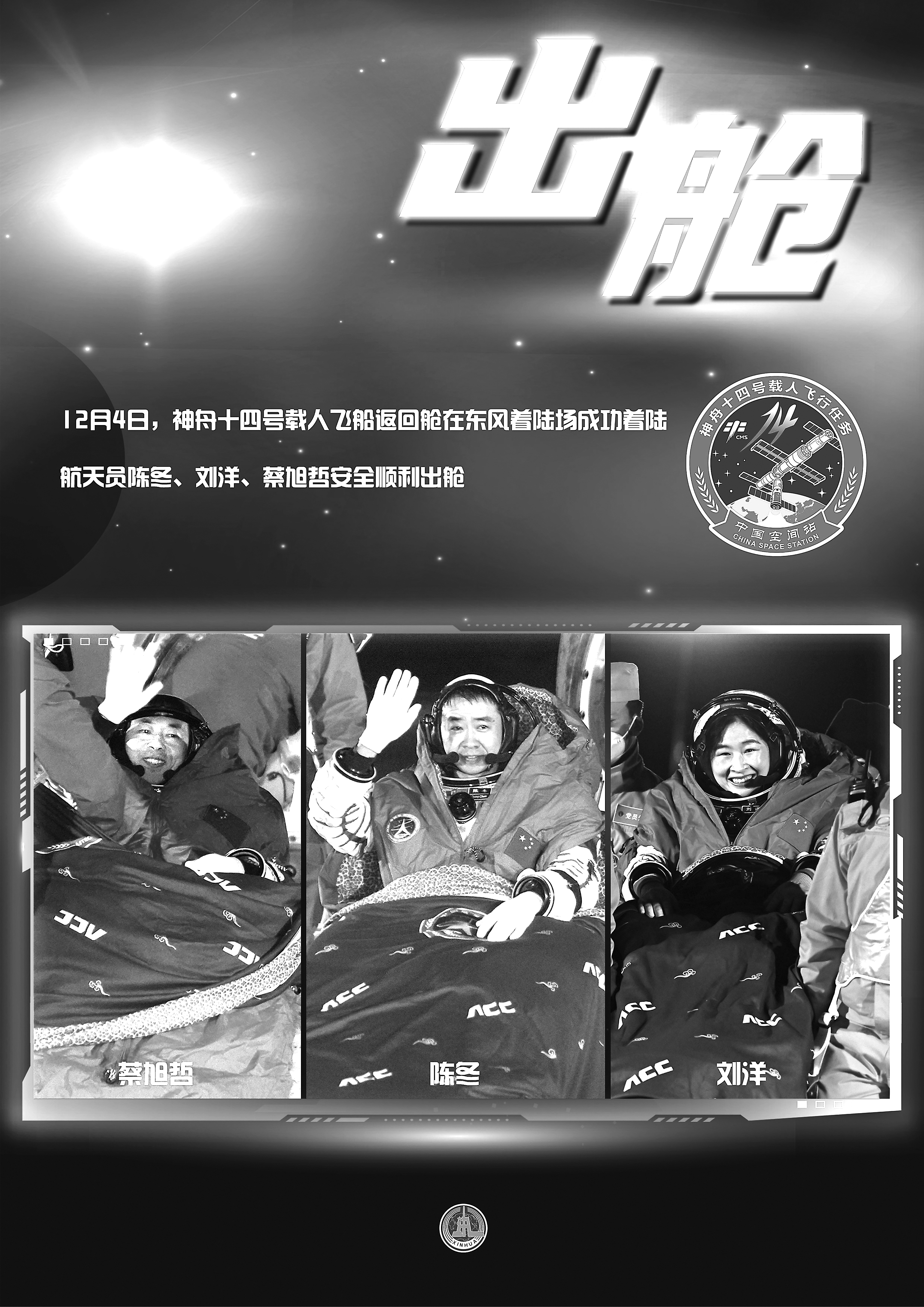 ▲12月4日,神舟十四号载人飞船返回舱在东风着陆场成功着陆,航天员陈冬、刘洋、蔡旭哲安全顺利出舱。 新华社发