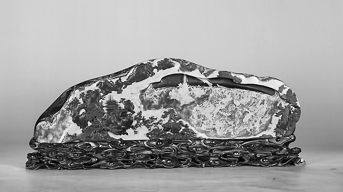 《新安揽胜砚》根据近现代国画大师陆俨少“新安揽胜图”创作。原画提款“新安江上游以至深渡,所谓三百六十滩,新安在天上者,江回峡束,风光壮丽。”《新安揽胜砚》以画入砚,充分利用贺兰石特有纹理,巧妙布局徽州山水的怡人风光。砚的最上端为远景,利用砚石的绿彩雕刻了亭院、拱桥、远山以及各种树木花草,有万山重叠,上接霄汉之势。中景为砚的中间部分,描绘了新安江上瀑流激荡,清美涧壑,宝塔、楼宇穿插点缀在其左右,同时该部分也被处理为砚堂。近景为砚的左边,运用镂雕和平雕相结合的手法,细致刻画了新安江边的景色,亭台楼宇、山石树木美不胜收,船舶漂流其中,让人流连忘返。整件作品层次分明,山石楼阁疏密分布,显得浑然一体。既有细致入微的雕刻,又有虚无缥缈的浩瀚,彰显大气。