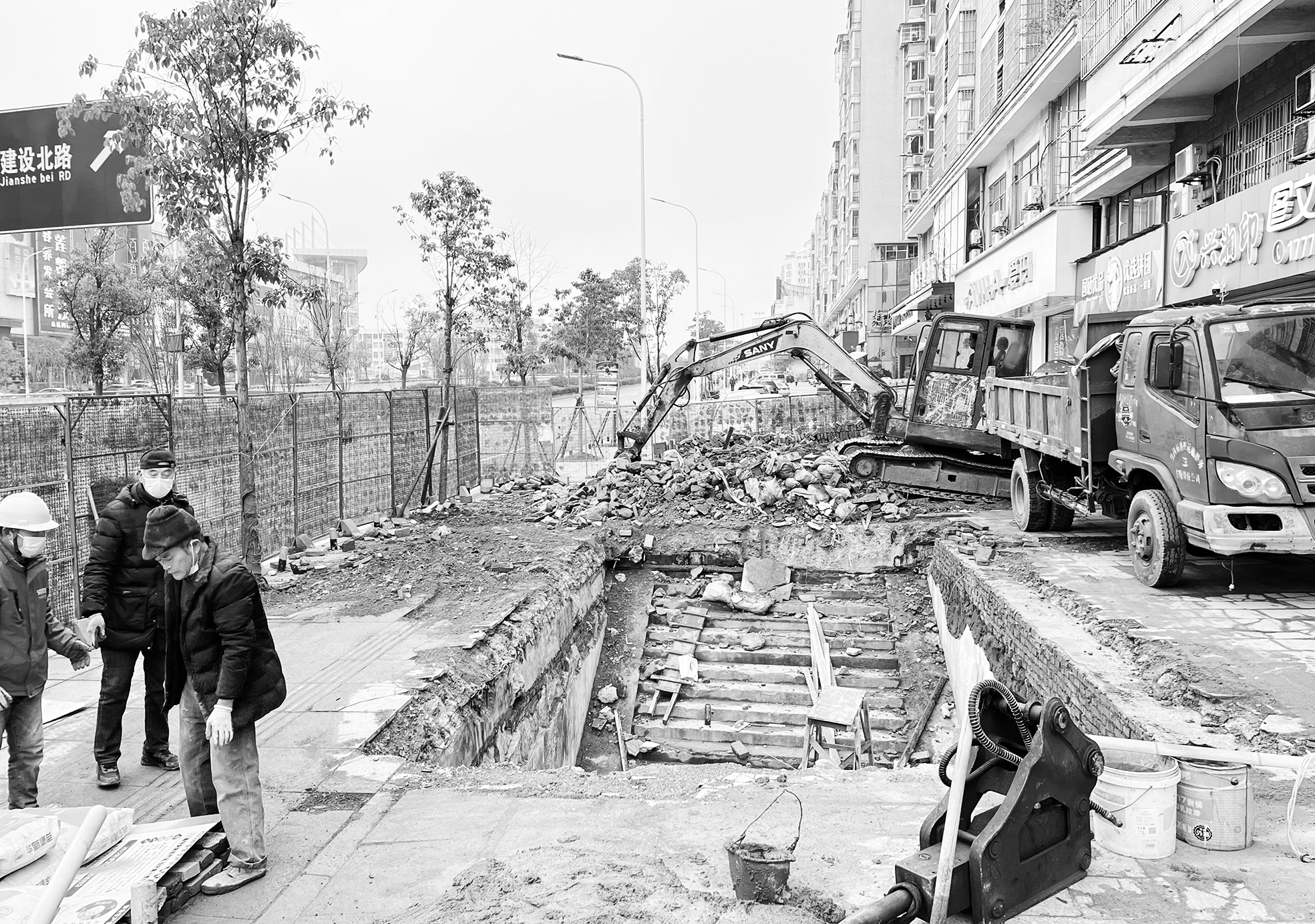 ▲围住地下通道出入口的围墙被拆除,方便接下来的施工作业。 记者/刘平 摄
