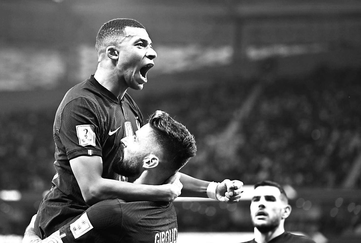 ◀12月4日,法国队球员吉鲁(下)在进球后与队友姆巴佩庆祝。新华社记者/肖艺九 摄