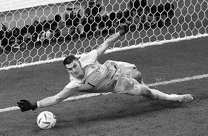 ▲12月5日,克罗地亚队守门员利瓦科维奇在比赛中扑出日本队球员三笘薰主罚的点球。新华社记者/孟永民 摄