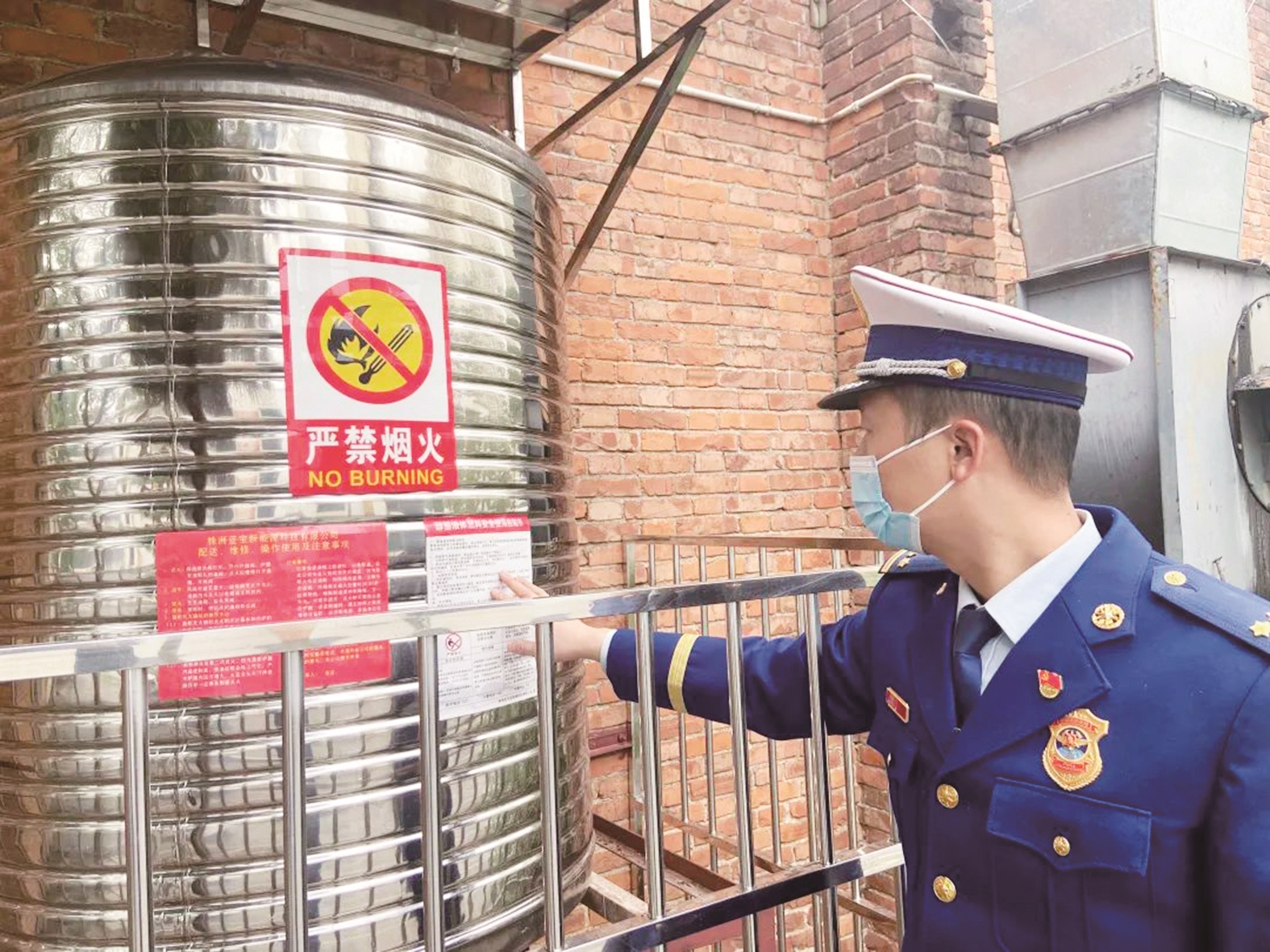 ▲消防监督员检查餐饮店“环保油”使用情况。通讯员供图