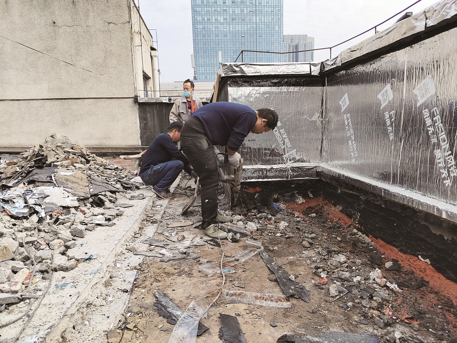 ▲施工人员拆除楼顶原有防水层。记者/易楚曈 摄