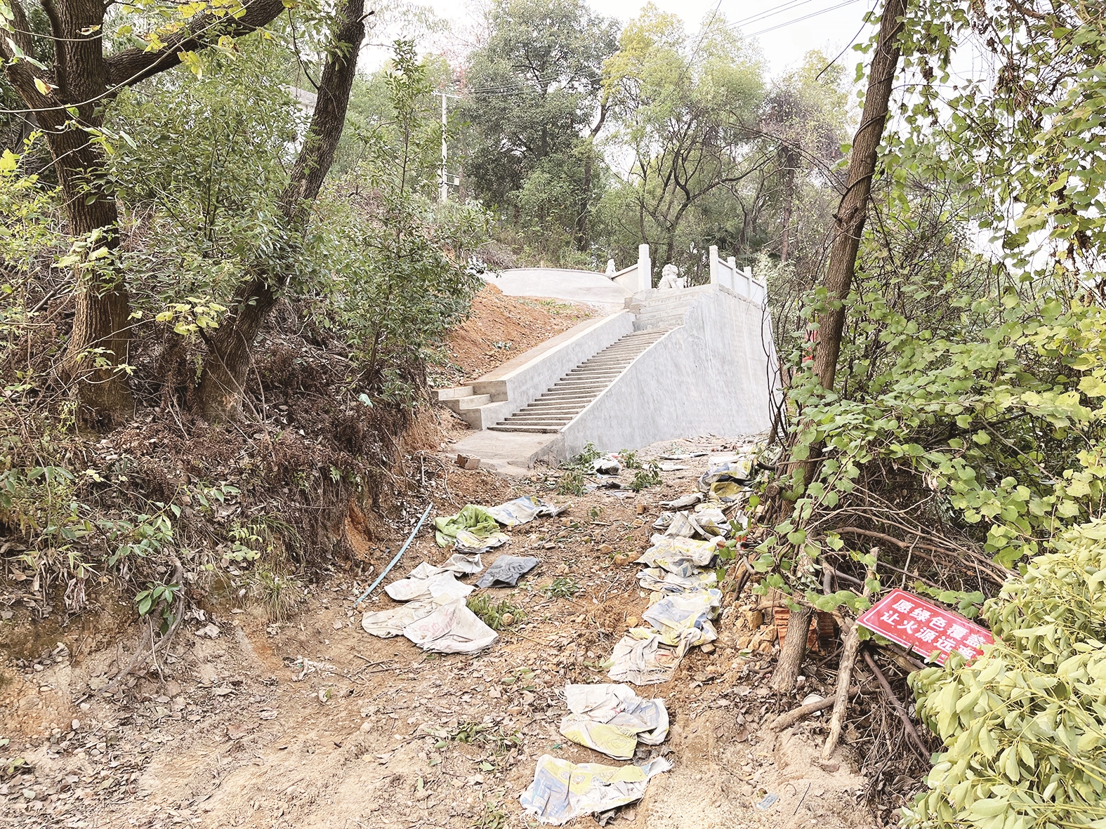 路边树林与响石岭街道先锋社区先锋一组散户区为邻,树林中除了新建的墓地,还分布有多座硬化的坟墓。有附近居民指出,新硬化的墓地,其墓穴在今年上半年就已经建好,最近才进行硬化。